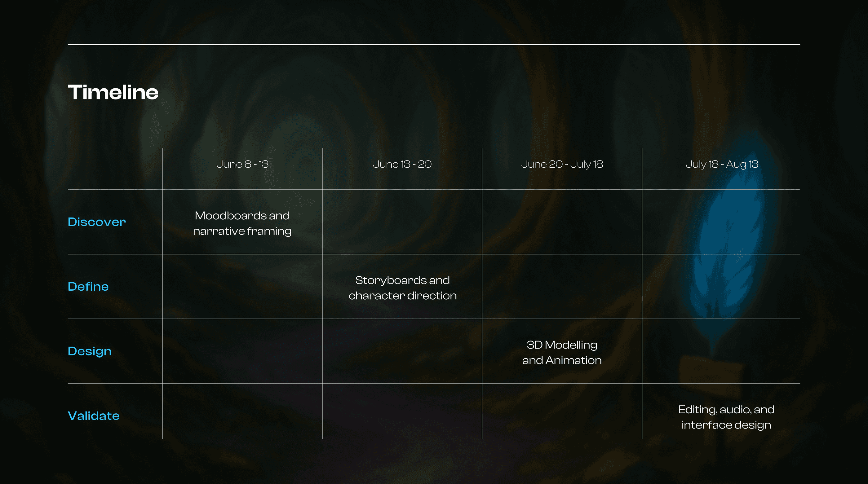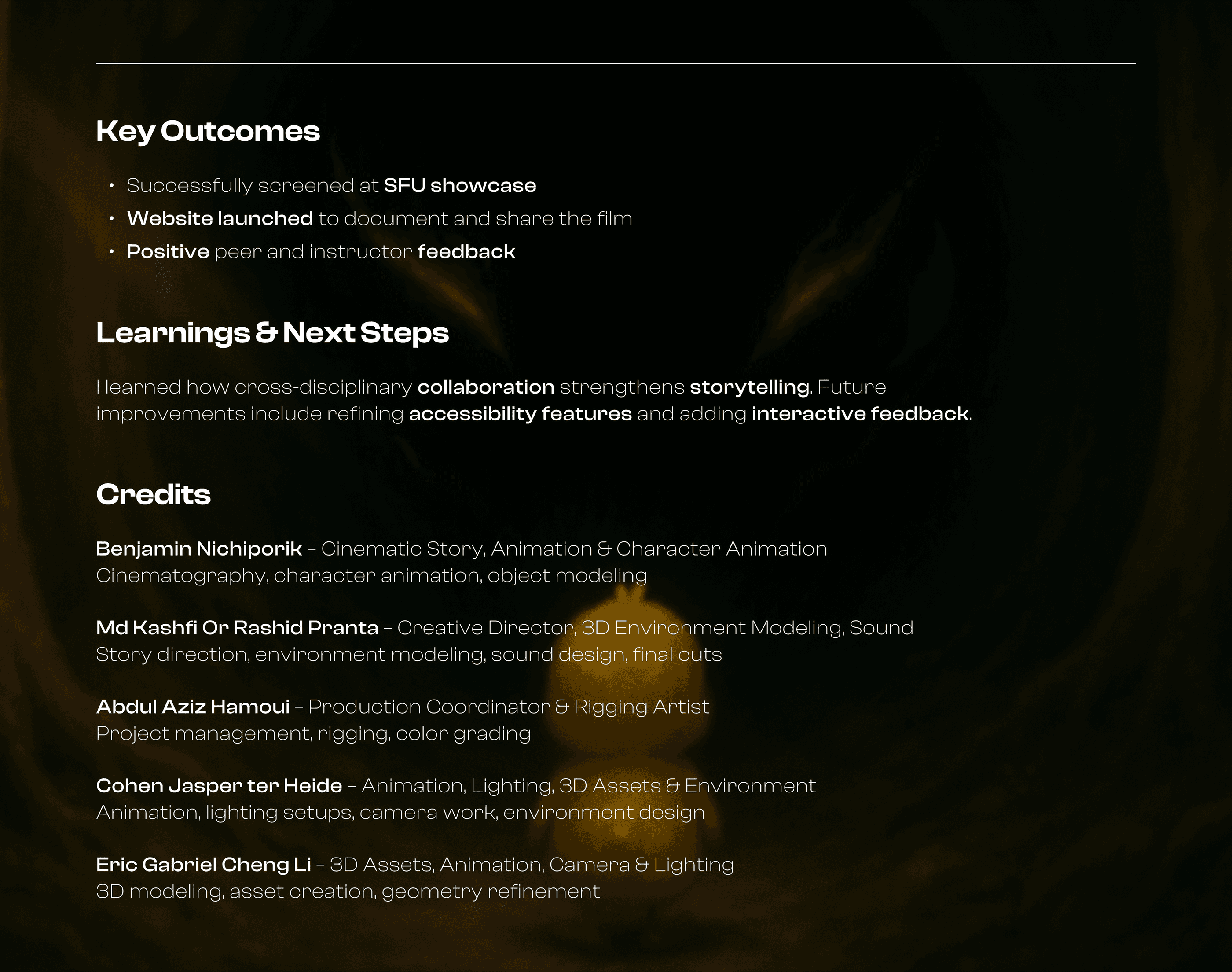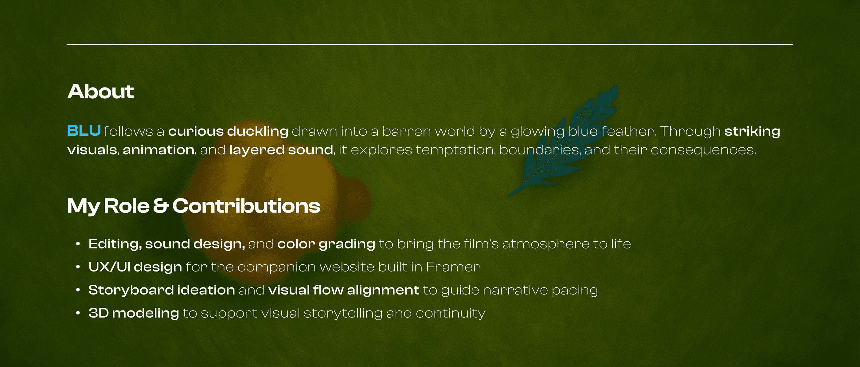 Editing, sound design, color grading, UX/UI for the companion site, storyboards, and 3D modeling.