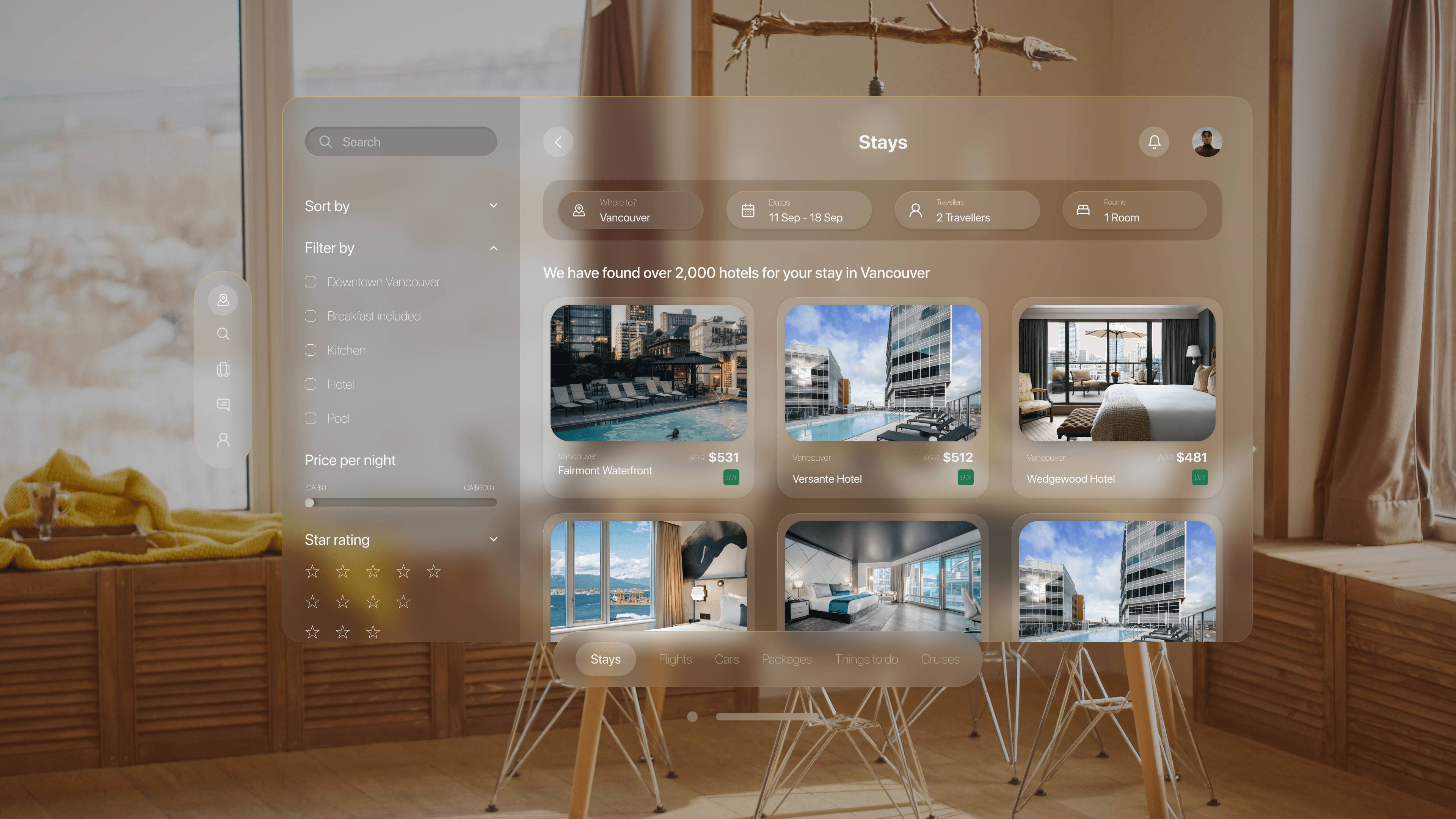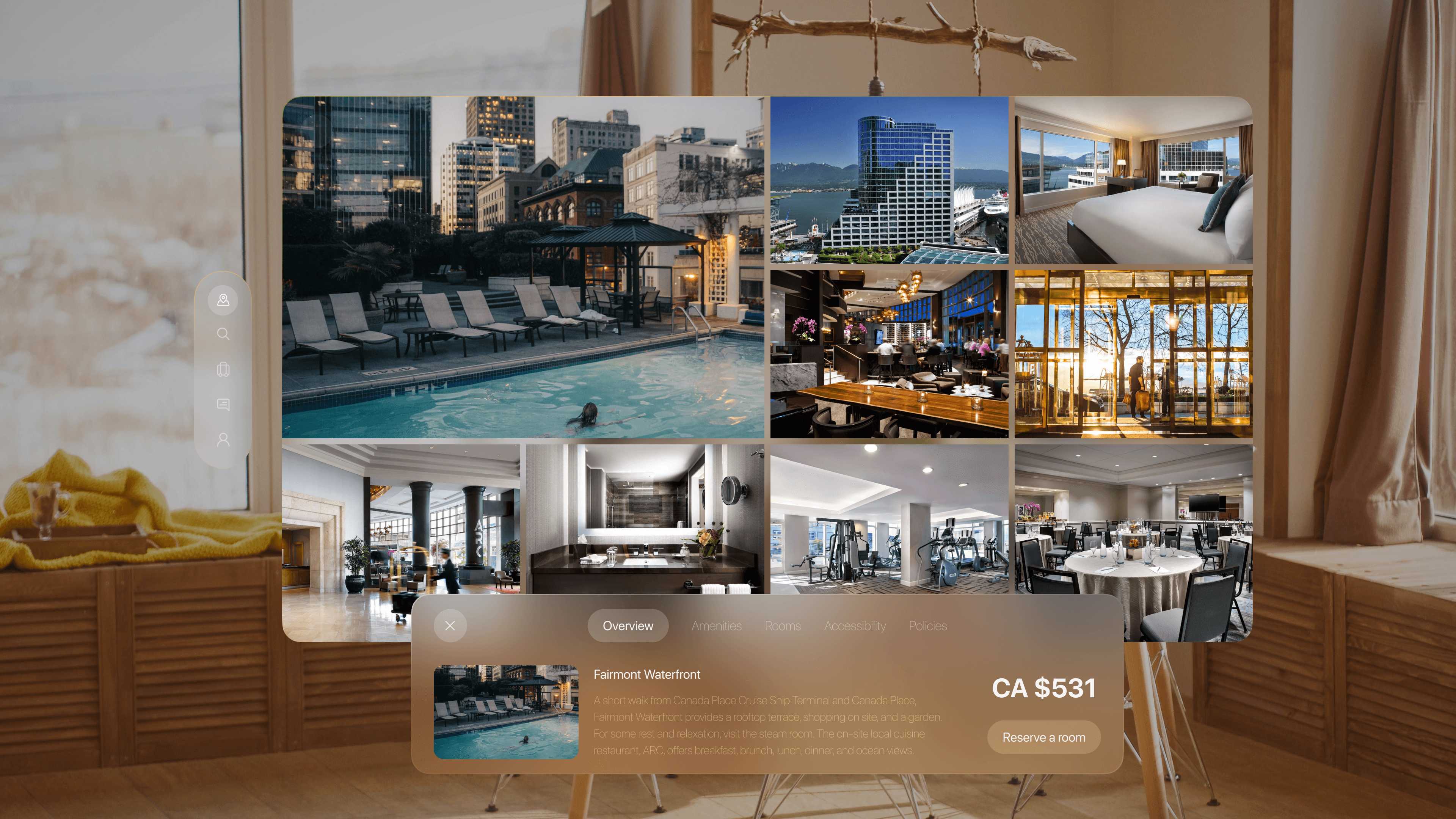 Create a calm spatial experience that feels natural to eyes and hands. Prioritize “find and decide” tasks with large imagery, clear hierarchy, and glass surfaces tuned for legibility and comfortable brightness.